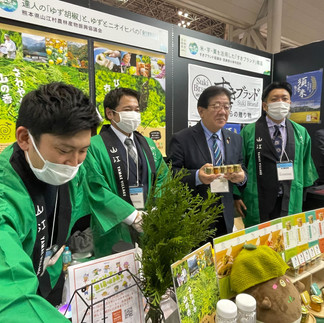 山江村農林産物振興協議会では、村で未活用だった農林産物を有効活用し、「山江村の達人のゆず胡椒」と「山の香エッセンシャルオイル」の2つの新商品を開発しました。新商品のPRと販路開拓のため、2月6日(火曜日)~8日(木曜日)の3日間にかけて東京ビッグサイトで開催された「第35回グルメ&ダイニングスタイルショー春2024 山の恵みプロジェクトコーナー(商談会)」に出展しました。